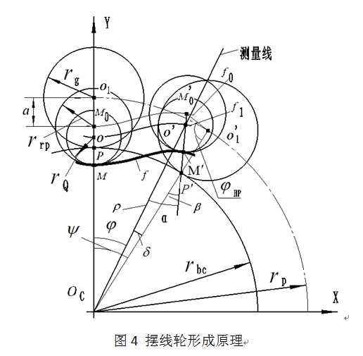 通過采集數據進(jìn)行(háng)計算並與理論(lùn)擺線(xiàn)、設計擺線的齒廓進行對比,得到擺線齒輪誤差。擺線齒輪測(cè)量的測頭軌跡曲線是理論短幅外擺線(xiàn)的等距曲線[4],它的形成原理如圖4所示(shì)。