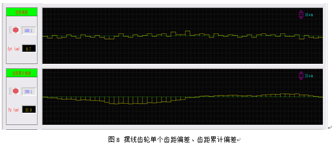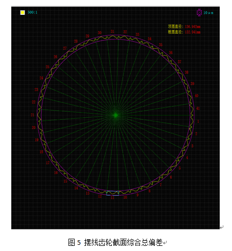 擺線齒輪測量儀通過由極坐標測(cè)量結合計(jì)算機密集采樣的測量原理,可(kě)以快(kuài)速的得到擺線齒輪整周的徑(jìng)向(xiàng)誤差曲線,處理得到截麵綜(zōng)合總(zǒng)偏(piān)差,截麵綜合總(zǒng)偏差表示擺線齒輪(lún)整轉的誤差情(qíng)況,實踐中可以快速判斷擺線齒輪的加工情況,結果如圖5所示(shì)。