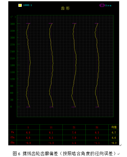 以上第一種齒廓表達形式,在誤差曲線長度(dù)方(fāng)向是擺線的等距齧合(hé)角度,反應的是擺線齒輪的齧合(hé)特性,而後一(yī)種齒廓(kuò)表達形式,是轉(zhuǎn)化成直角坐標(biāo),清晰表達理論齒廓,設計齒廓及測量實際誤差曲線的關係,更(gèng)緊密結合CAD數字化設(shè)計製造的評(píng)判(pàn)。
