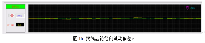 頂根距偏差和徑向跳動誤差由已經測量出擺線齒輪整(zhěng)周的數據,通(tōng)過數(shù)據處理,可(kě)以得到全部頂根距誤差變動曲(qǔ)線和徑向跳動誤差變動曲線,測(cè)量偏(piān)差結果如圖9、10所示。