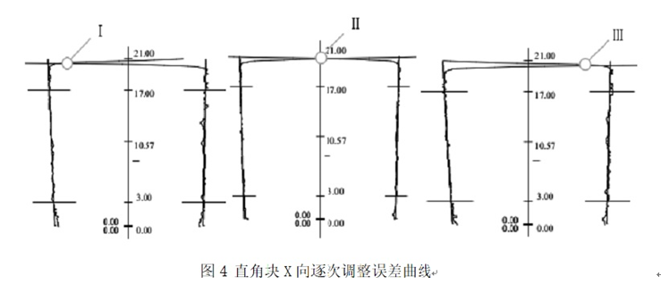 循環以上過程,根據調整完成的直角塊位置坐標重新標定後,再次進行測量,調(diào)整,對於有經(jīng)驗的(de)操作人員,經過幾次循環很快就會得(dé)到滿足儀器X向坐標精度要求的直角塊在儀器X向的坐標(biāo)位(wèi)置(zhì)。圖3是儀器X向調整(zhěng)流(liú)程圖,圖(tú)4是調整直角塊X坐(zuò)標得到(dào)的齒形誤差曲線。