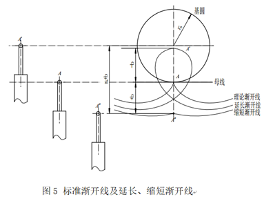 根據漸開線的(de)展成原理,在基圓內的一(yī)點,隨(suí)著漸開線的展(zhǎn)成形成的軌跡叫做“延長漸開線”,而基(jī)圓(yuán)外的一點形成的軌跡是“縮(suō)短漸開線”,無論“延長漸開(kāi)線”,還(hái)是“縮短漸(jiàn)開線”與基(jī)準漸(jiàn)開(kāi)線相(xiàng)比較,其在漸開線的起始位置也即齒輪的根部位置,會造成比較明顯的大誤差,而隨著漸開(kāi)線的展開,誤差(chà)會(huì)逐漸減小,如(rú)圖5所示。