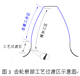 齒輪加工比較多的采取“滾-剃”、“滾-磨(mó)”兩(liǎng)次加工工藝以提高齒麵精度,這樣就會在齒輪根部產生一(yī)個“工藝過渡區”,形成(chéng)工藝結合部的台階過渡。如(rú)圖3所示,這個過渡區會在齒輪使用過程中產生應力集中現象,影響齒輪使用過程中受力和斷(duàn)裂損(sǔn)壞情(qíng)況。隨著對齒輪製造質量的提(tí)高,評價齒輪輪(lún)齒根部工藝過渡區越來(lái)越得到一些客戶的重(chóng)視。