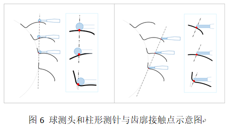 采用“三軸展成+柱形測頭”方案更適合小(xiǎo)模數齒輪的(de)測量,測針剛性好,易於製造(zào),這個方案的提出本(běn)身就是解決針對小(xiǎo)微齒輪測量的,具有很大(dà)優勢。另外,如上討論,采用柱(zhù)形測頭棱邊的點測頭測量,避(bì)免了球(qiú)形測頭帶(dài)來的“測頭半(bàn)徑影響”,得到更為精確的測量輪廓。