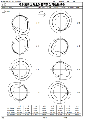 凸輪軸(zhóu)是發動機、機(jī)油泵(bèng)等機構裏關鍵零件。對於凸輪軸這樣的工(gōng)件在齒輪測量中心進行測量時,利用(yòng)齒輪測量中心獨有的精密(mì)回轉軸係,最方便的(de)測量方式是采用極坐標測量方式,而極坐標測量時,儀器徑向坐標在(zài)測量控(kòng)製過(guò)程中,由於與回轉(zhuǎn)主軸的運動非(fēi)線性,或者根本無法預知(zhī)運(yùn)動軌跡,利用(yòng)前述測頭(tóu)跟蹤技術很(hěn)容易(yì)實現測(cè)量,對回轉圓光柵、徑(jìng)向光柵(shān)及三維測頭徑向光柵進行數據采集(jí)處理,得(dé)到極坐(zuò)標的測量數據,並可(kě)進一步進行誤差(chà)處理,得到如凸輪軸升程誤差等項目。凸輪軸測量結果(guǒ)如(rú)下: