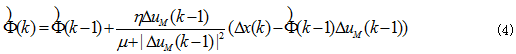 為實現式(2)表示的無模型自適應控製,需要利(lì)用時變偽偏(piān)導    。但由於(yú)被控係統的模型未知,所以    的精確值無法獲得。因此,需要利用係統的輸入和輸出數據近似估算    。設計了一種偽偏導估計(jì)準則函數